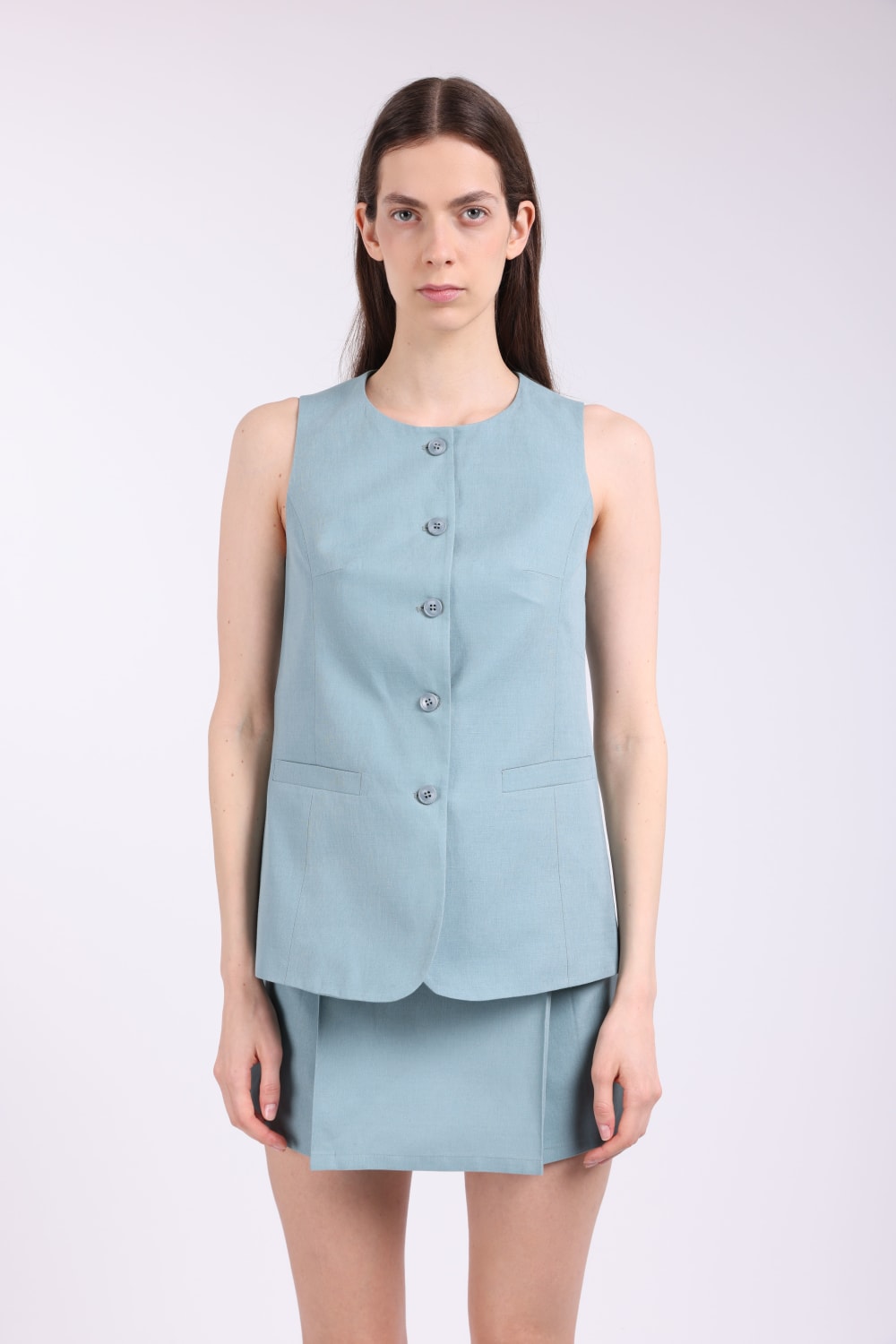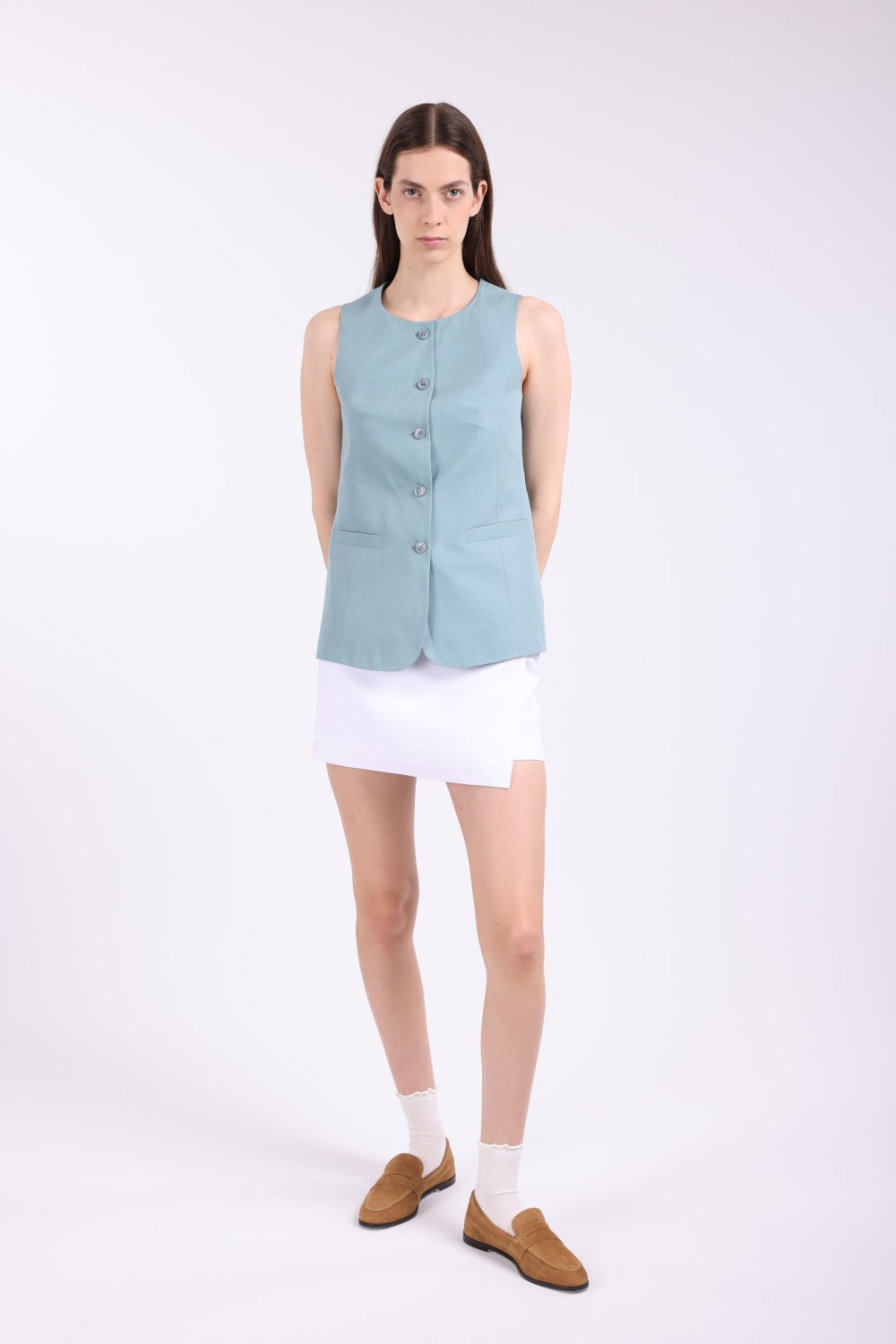 Yelek; Keten uzun yelek, arkası yırtmaçlı, bisiklet yaka, önü işlevsiz fleto cep, astarlı. Yelek Boy: 64 cm