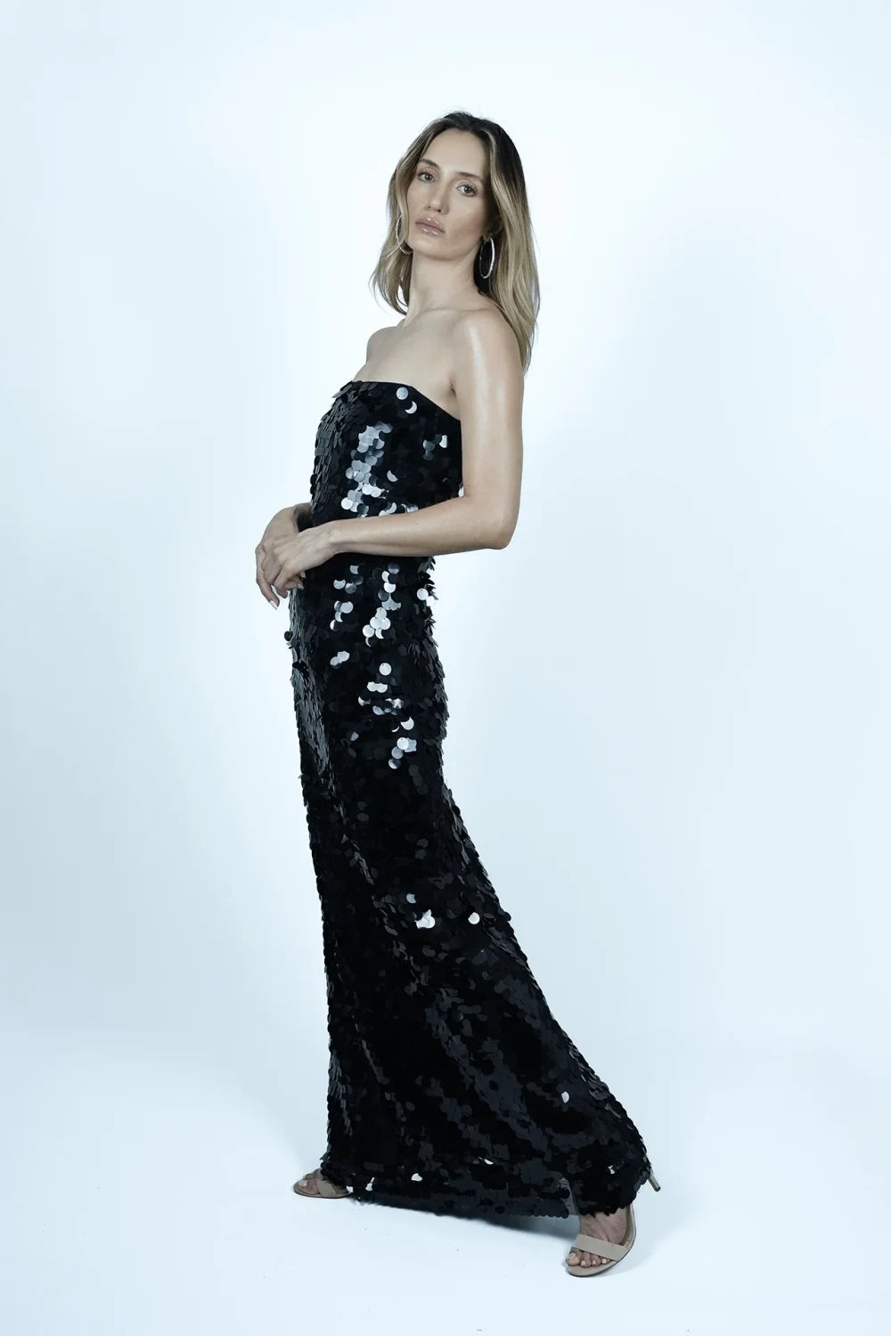 Geceye adım atarken etkileyici bir iz bırakmak isteyenler için tasarlanan Midnight Mirage, gizemli ve çarpıcı duruşuyla dikkat çeker. Tamamı iri siyah payetlerle kaplı bu straplez elbise, ışığı yansıtan yapısıyla sofistike bir ışıltı sunar. Düz kesimi ve yere kadar uzanan formu ile zarafeti sade bir şıklıkla buluşturur. Davetler, gala geceleri ve özel organizasyonlar için kusursuz bir tercihtir.