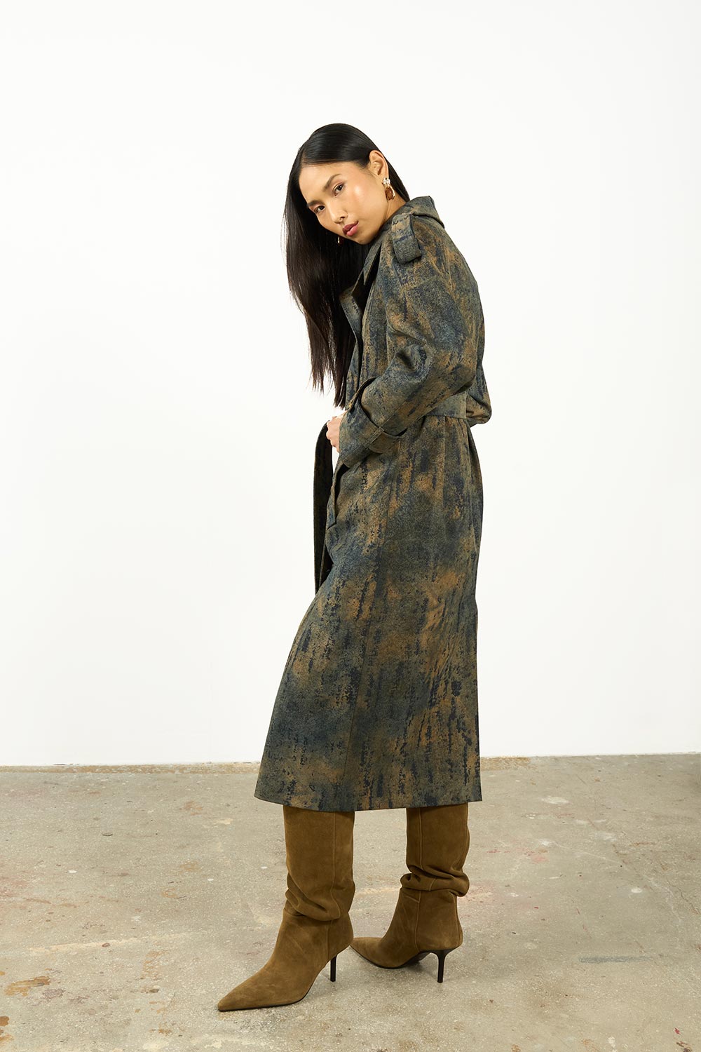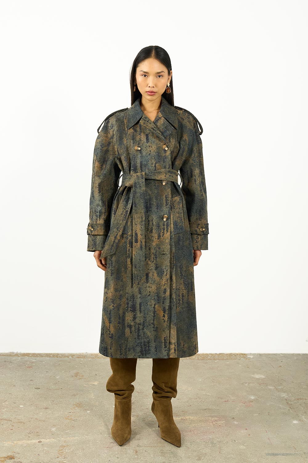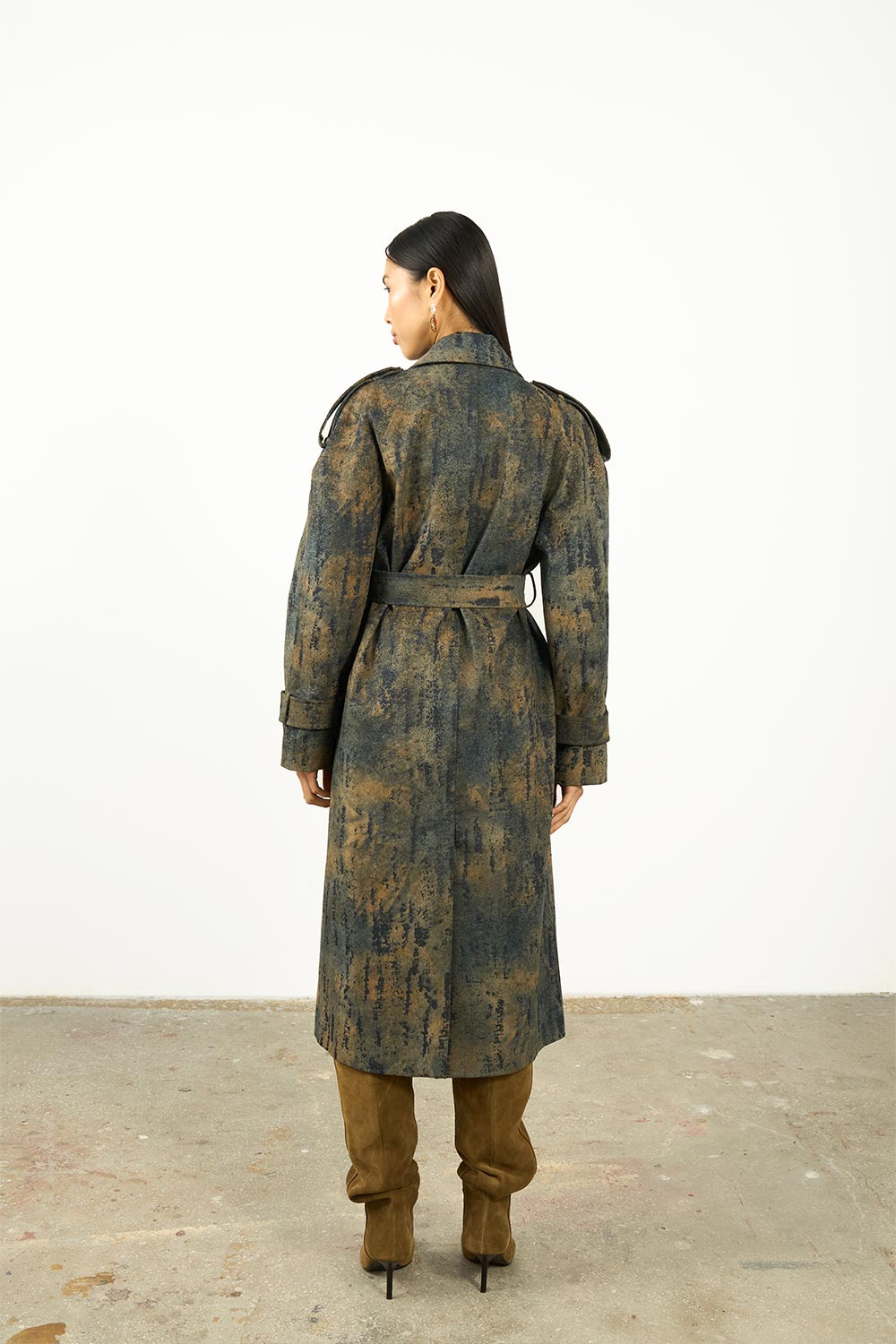 Zarif flok desenleriyle öne çıkan bu lacivert trençkot, klasik silueti modern bir dokunuşla buluşturuyor. Şıklığı ve asaleti bir arada sunan özel bir parça.