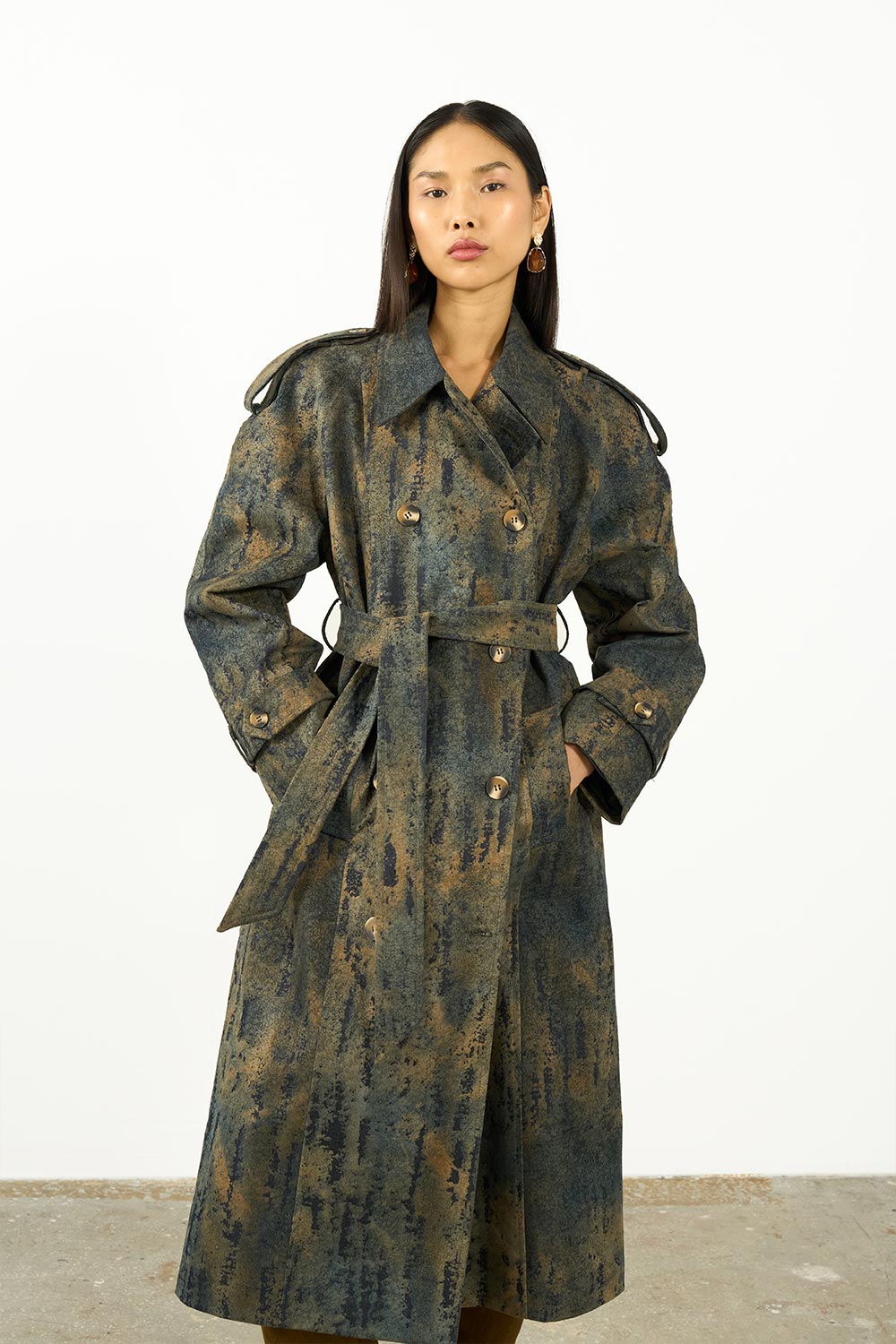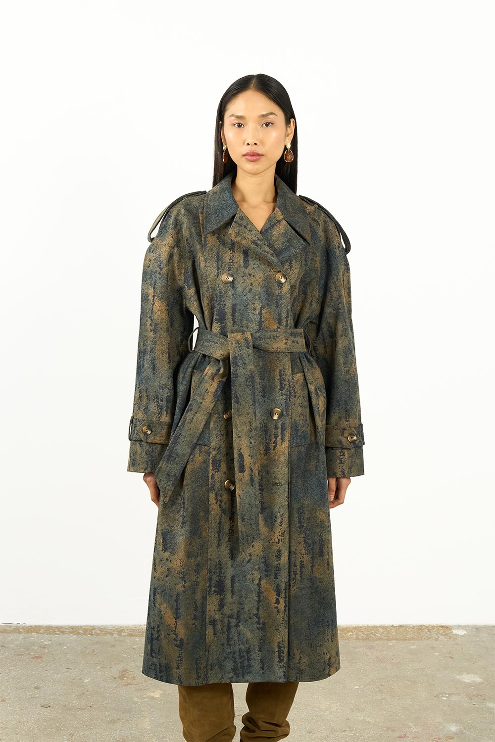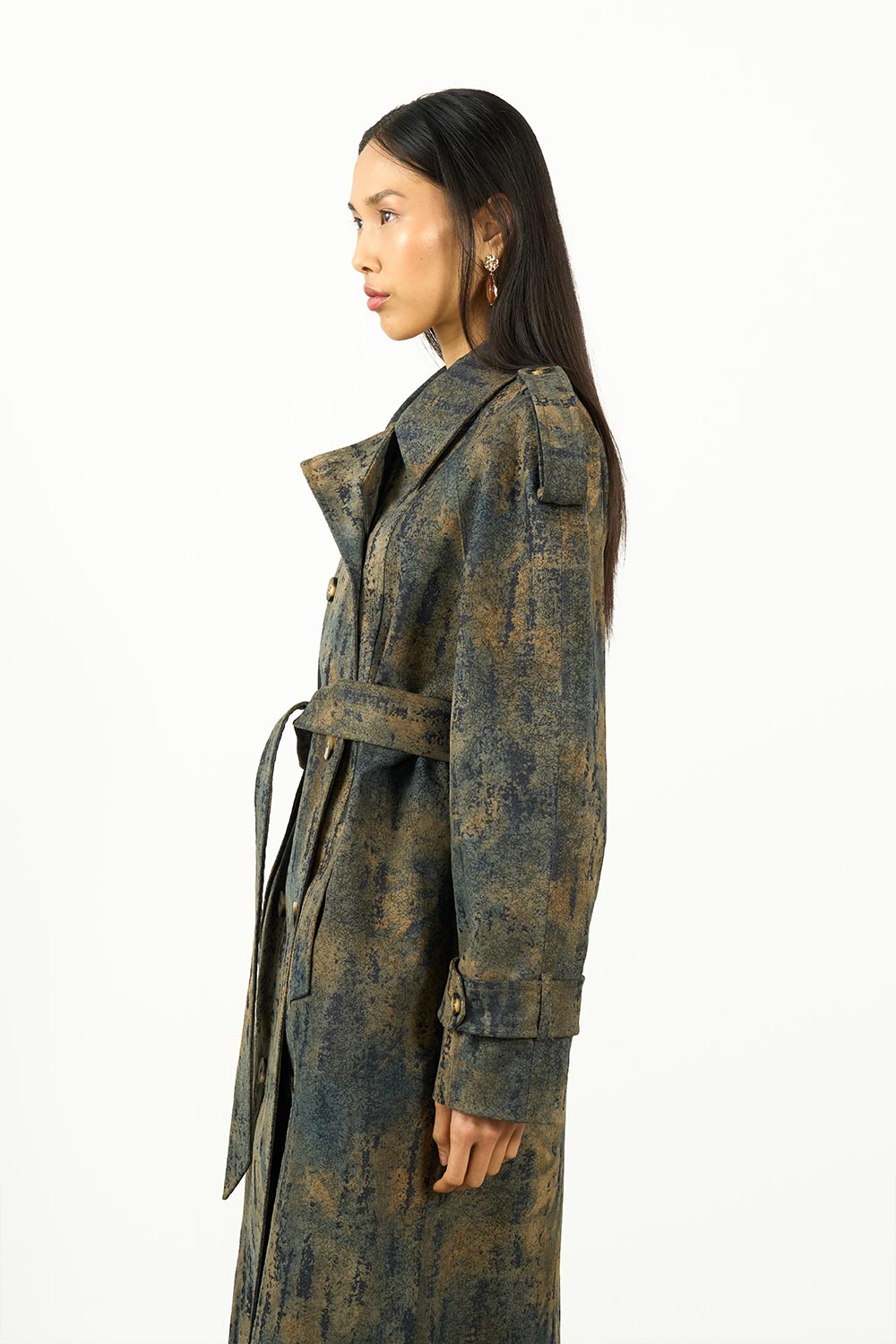 Zarif flok desenleriyle öne çıkan bu lacivert trençkot, klasik silueti modern bir dokunuşla buluşturuyor. Şıklığı ve asaleti bir arada sunan özel bir parça.