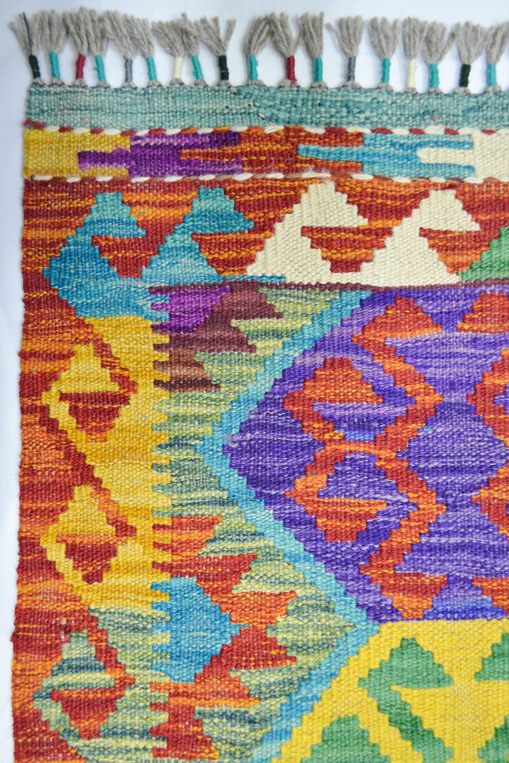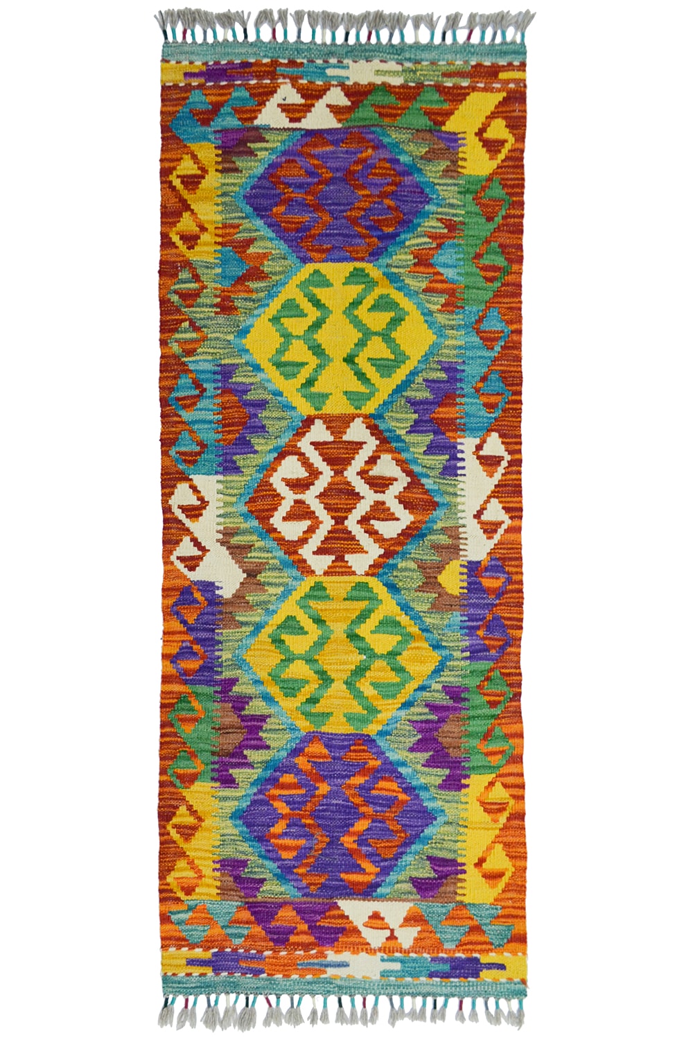 Afganistan’ın köklü dokuma geleneğini yansıtan bu el dokuma kilim, 53x146 cm (0.77 m²) ölçülerindedir. %100 yünden üretilen kilim, canlı ve çok renkli tasarımıyla mekânlara hareket ve enerji katar.