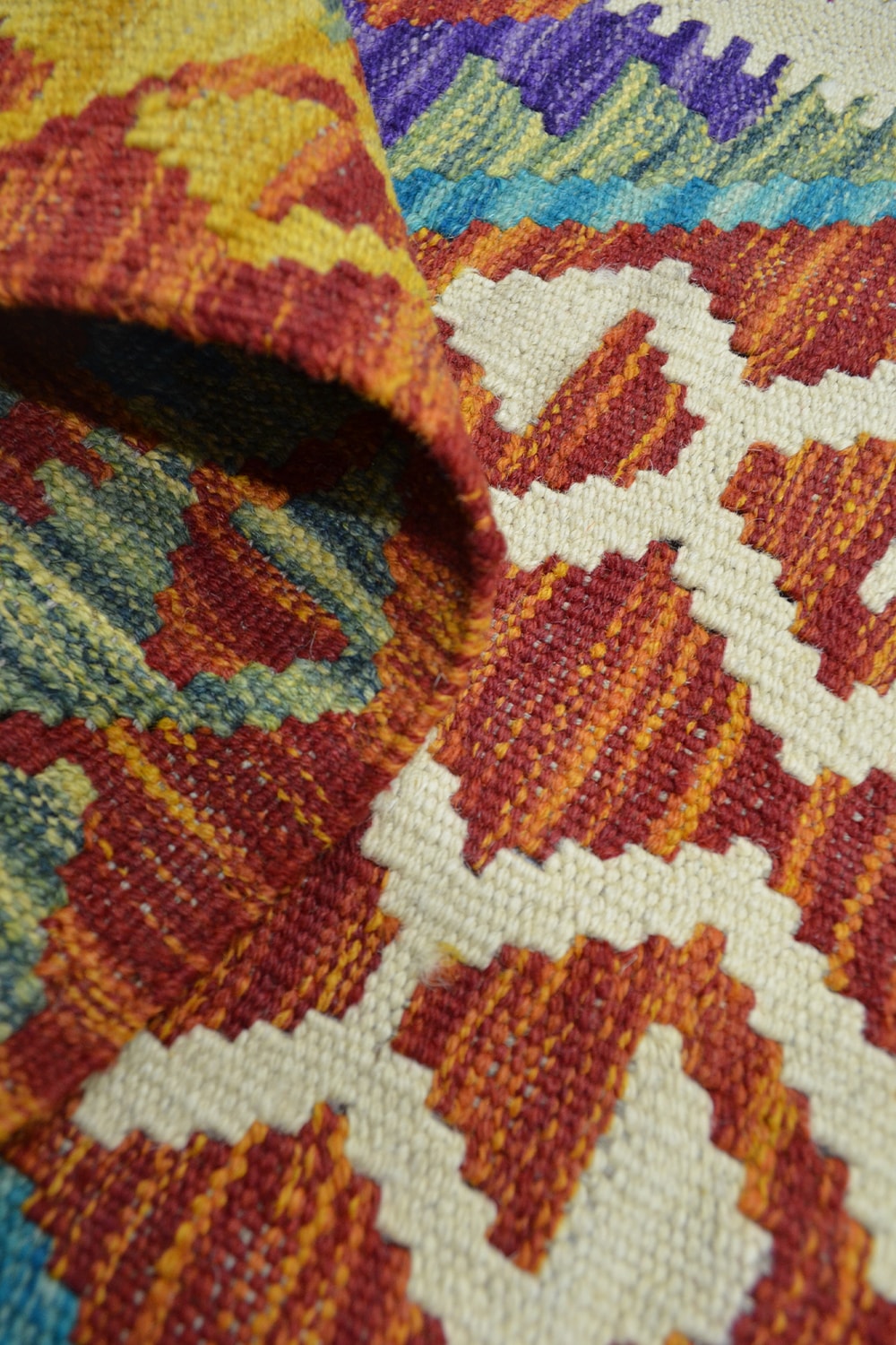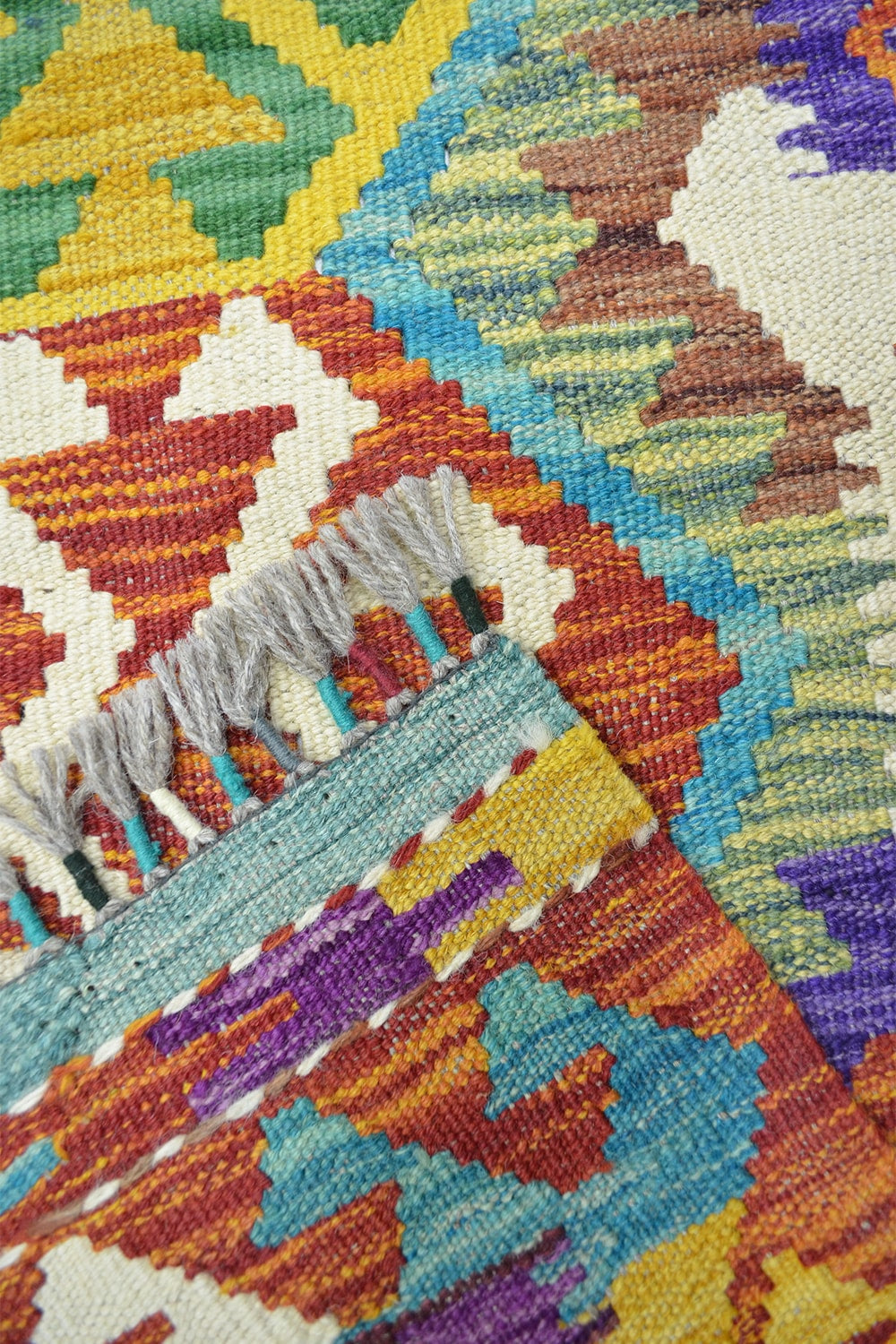 Afgan kilimleri, düz dokuma teknikleri ve geometrik desenleriyle bilinir. Renklerin cesur kullanımı, hem otantik hem de modern dekorasyonlarda dikkat çekici bir vurgu yaratır. El işçiliğinin doğal izlerini taşıyan bu kilim, her ilmeğinde ustalarının emeğini yansıtır.