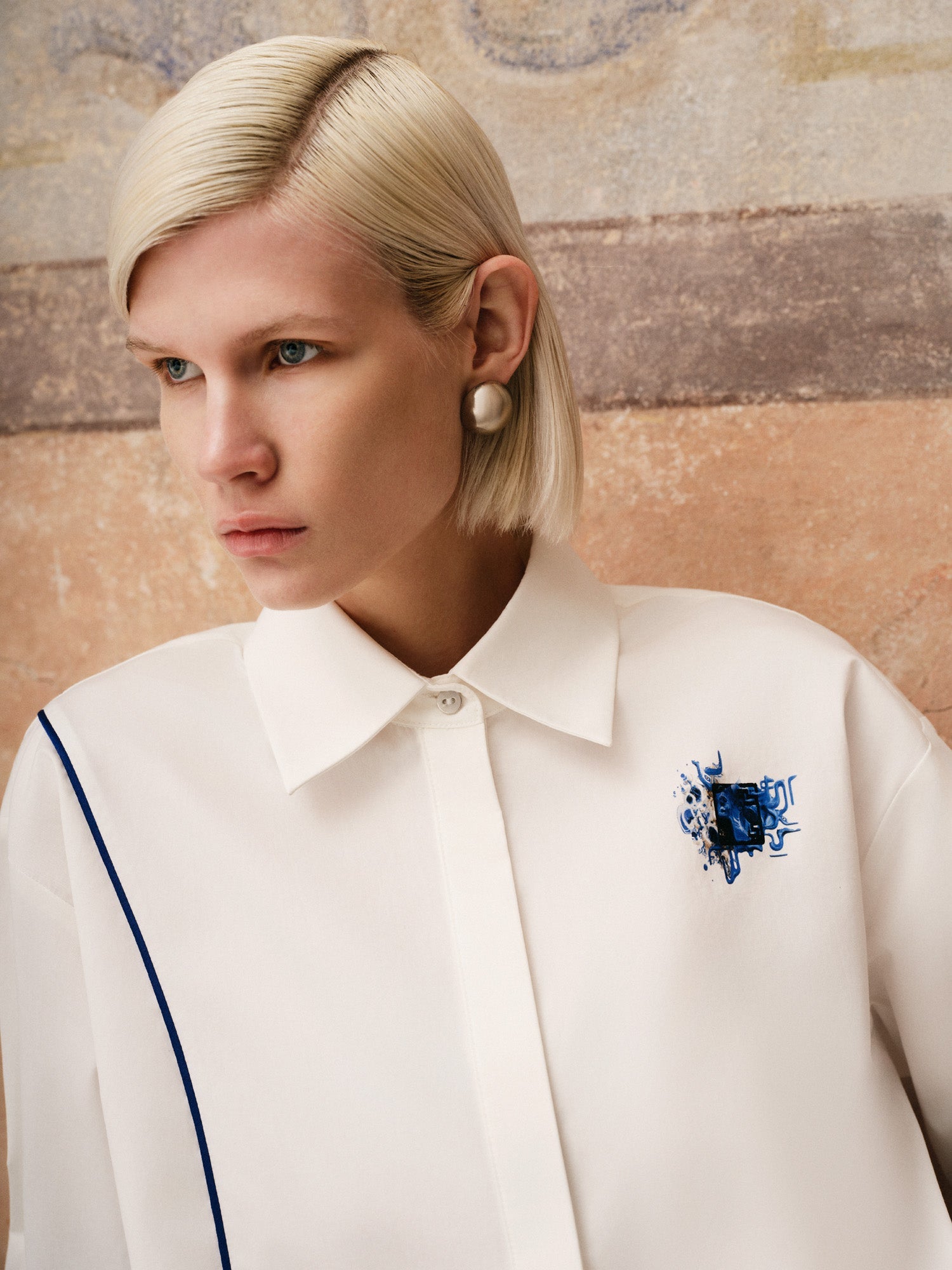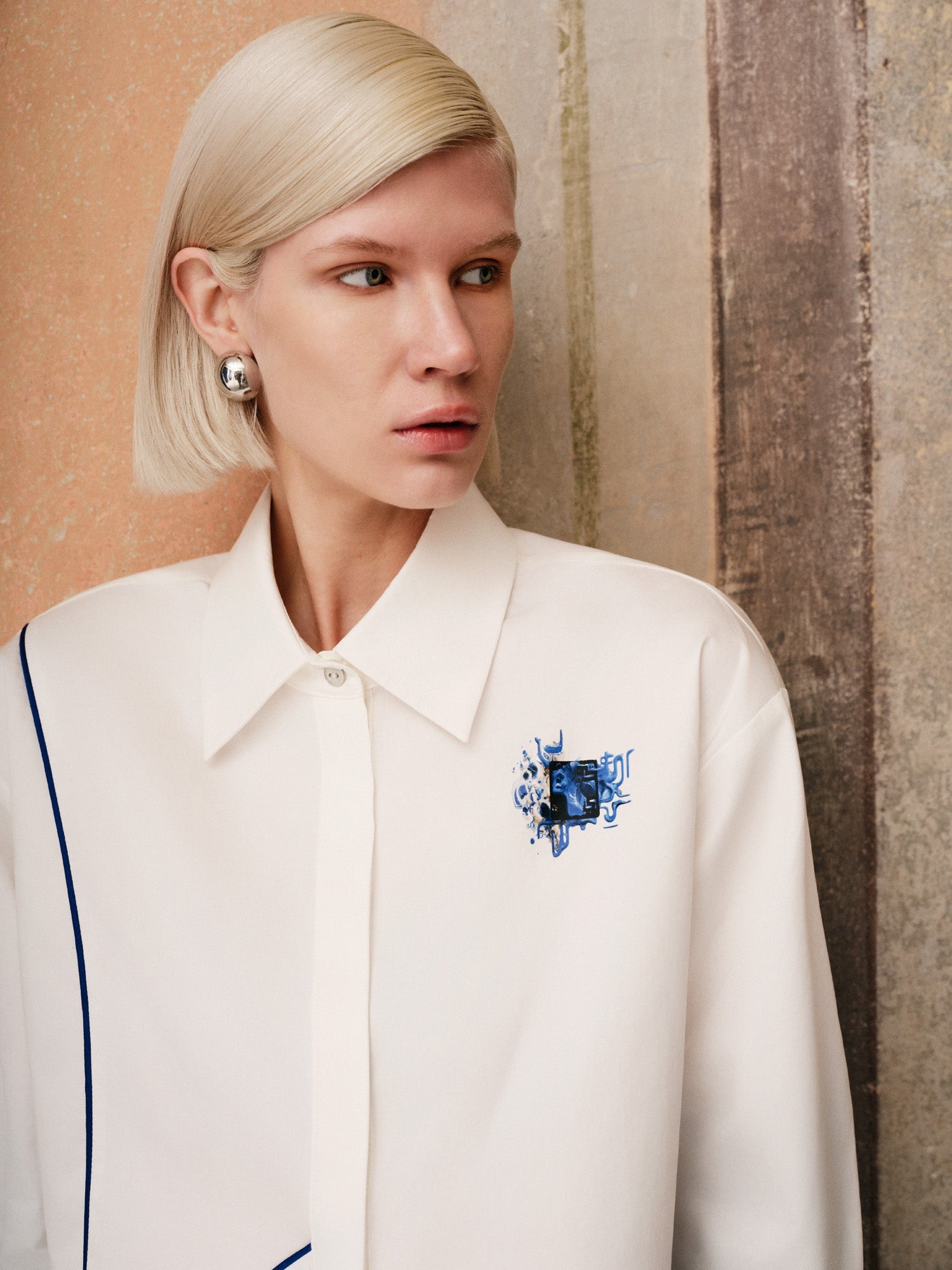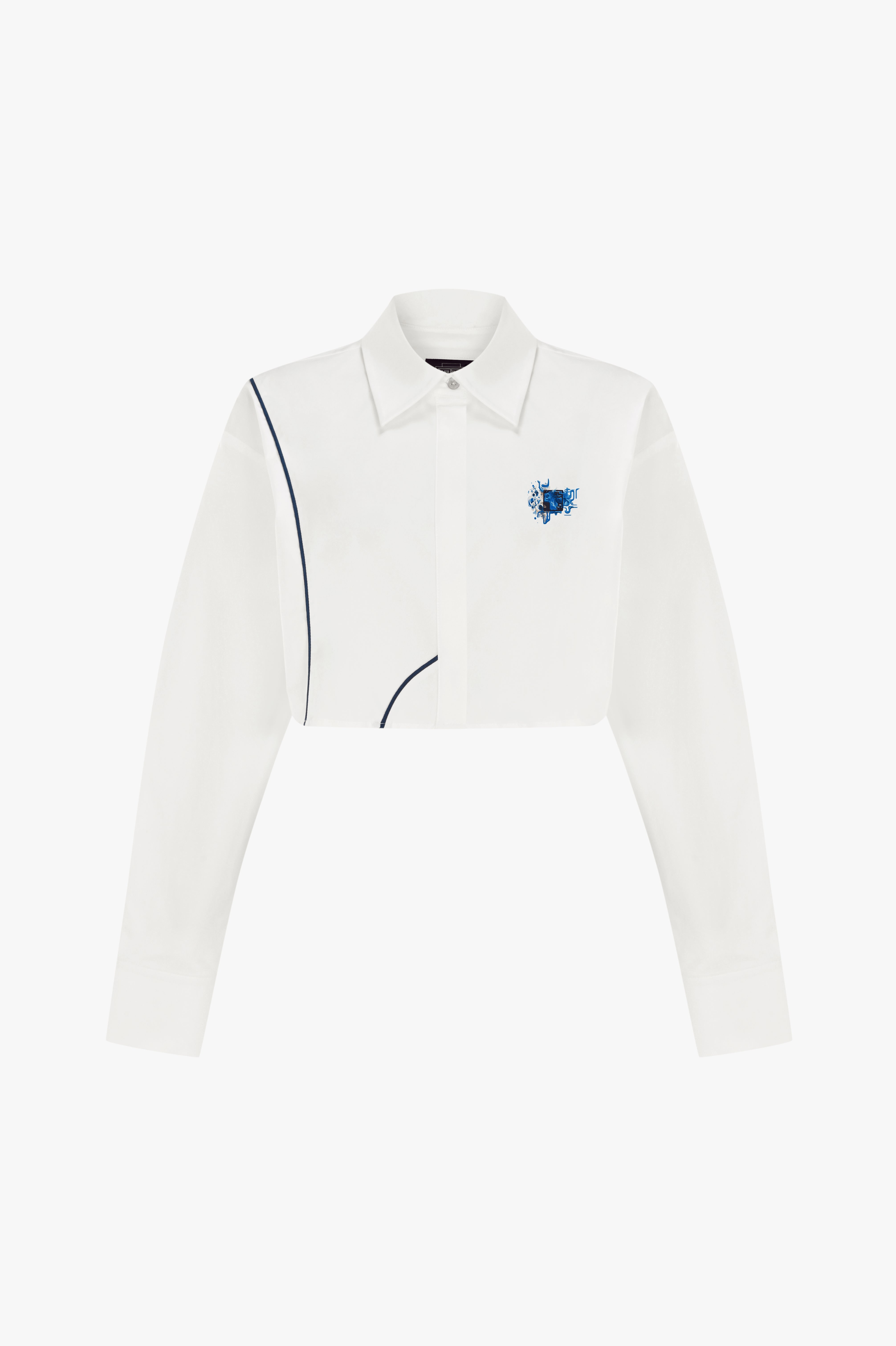 KNTLGY X SAMSUNG ZFLIP6P koleksiyonu, sınırlı üretim, poplin kumaş, mavi biye detaylı, logo baskı ayrıntılı crop gömlek.