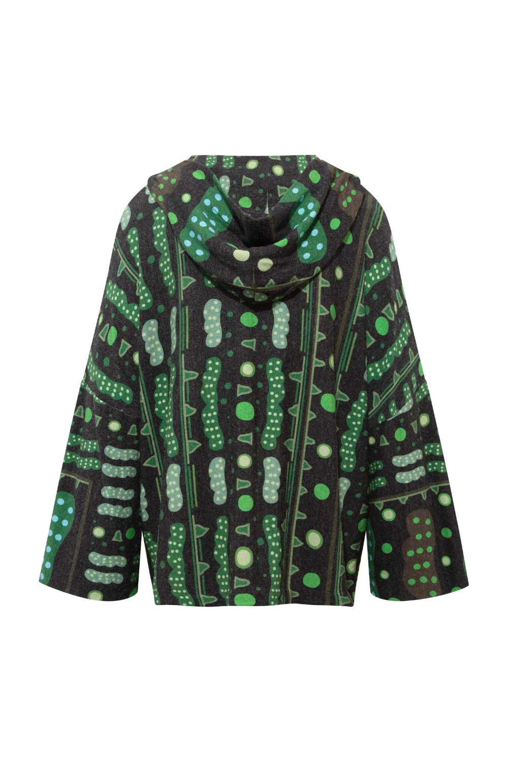 Desenler sanatçı Defne Camcıoğlu'nun resimlerden oluşmuştur,%82 Viskon, %13 Akrilik, %5 Elastan içeren örme bir kumaştır,Kumaş fırçalı/tüylü sıcak bir tuşeye sahiptir,Desenler dijital baskı yöntemi ile basılmıştır,Ürün esnek likralı kumaş yapısı sebebi ile tek beden olarak belirlenmiştir,bir çok forma uyum sağlamaktadır,Ürün 3/4 kol, v yaka ve kapüşon detayı ile spor şık bir görünüm sunmaktadır.