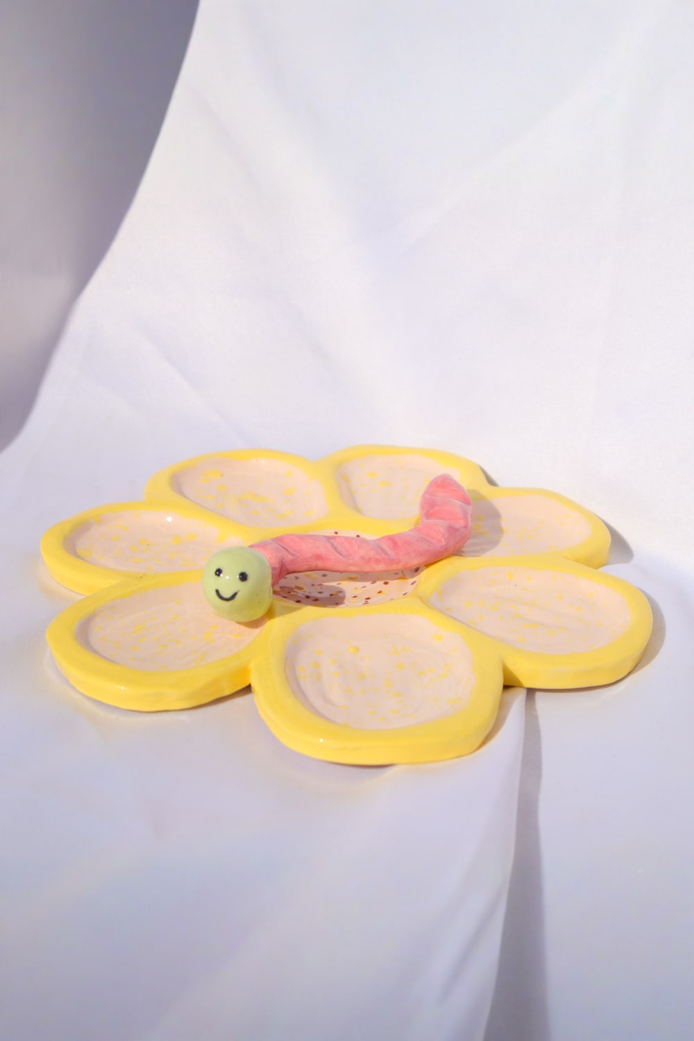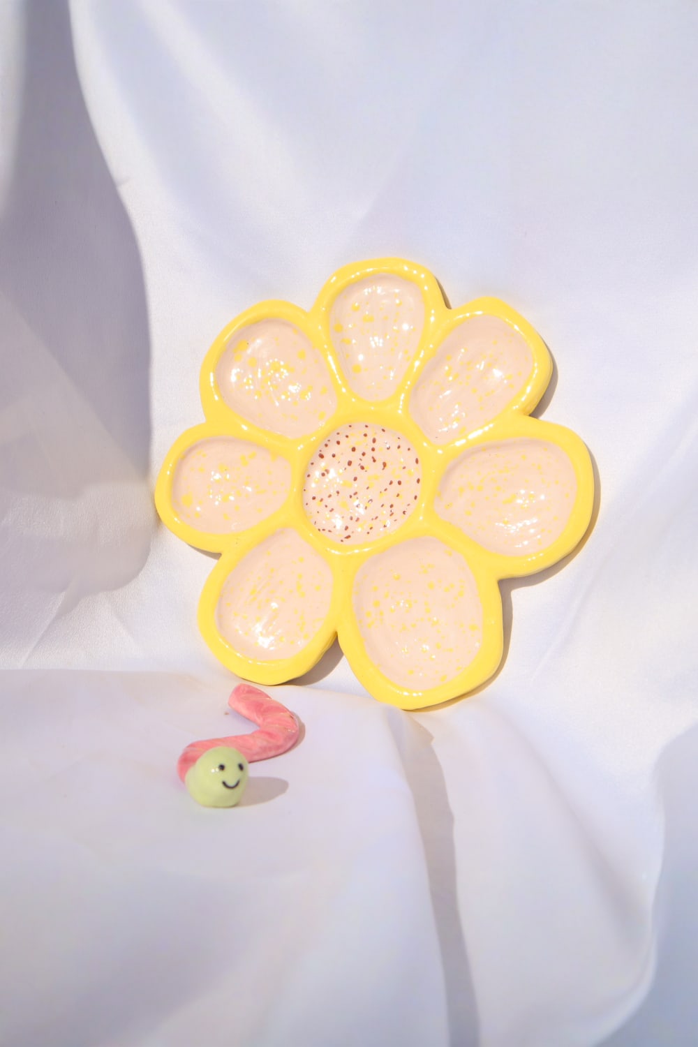 El Yapımı Seramik Modern Sarı Papatya Resim Paleti Ve Tatlı Pembe Tırtıl Fırçalık 2'li Set