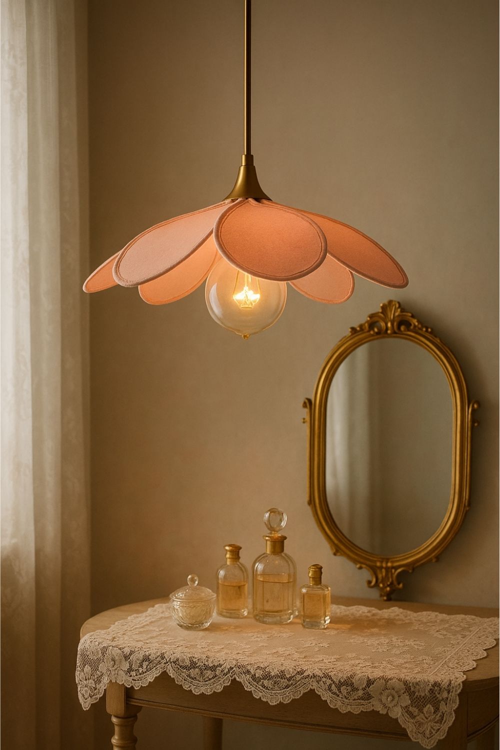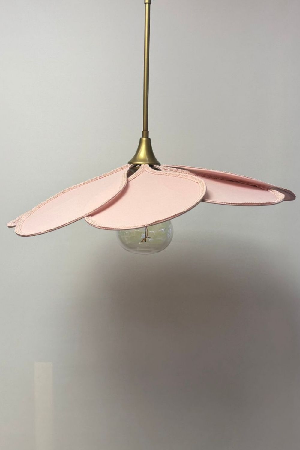 Serenella Sarkıt Avize, sade ama etkileyici formuyla dikkat çeken, estetik ve fonksiyonel bir aydınlatma tasarımıdır.Beş yapraklı, çiçek formundaki pembe kumaş kaplamalı kanatları ve pirinç tonundaki askı detayı ile hem modern hem de romantik bir görünüm sunar.Alt bölümdeki açık ampul tasarımı, ışığın mekâna doğrudan ve sıcak şekilde yayılmasını sağlar.