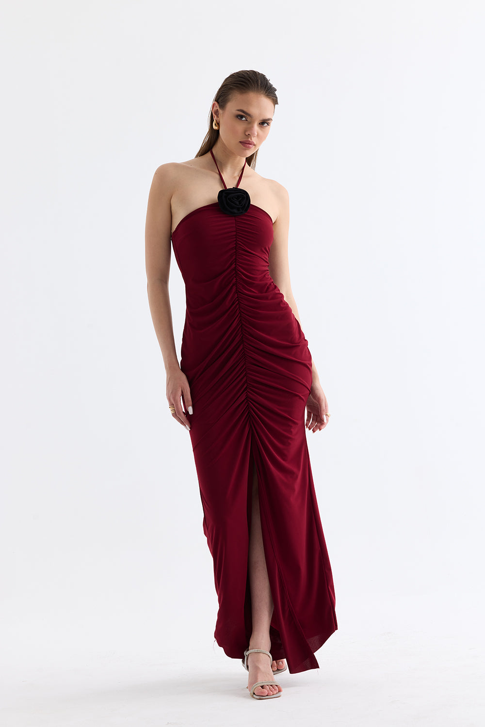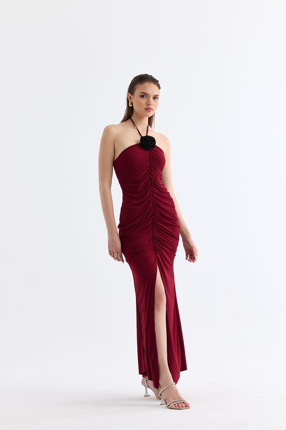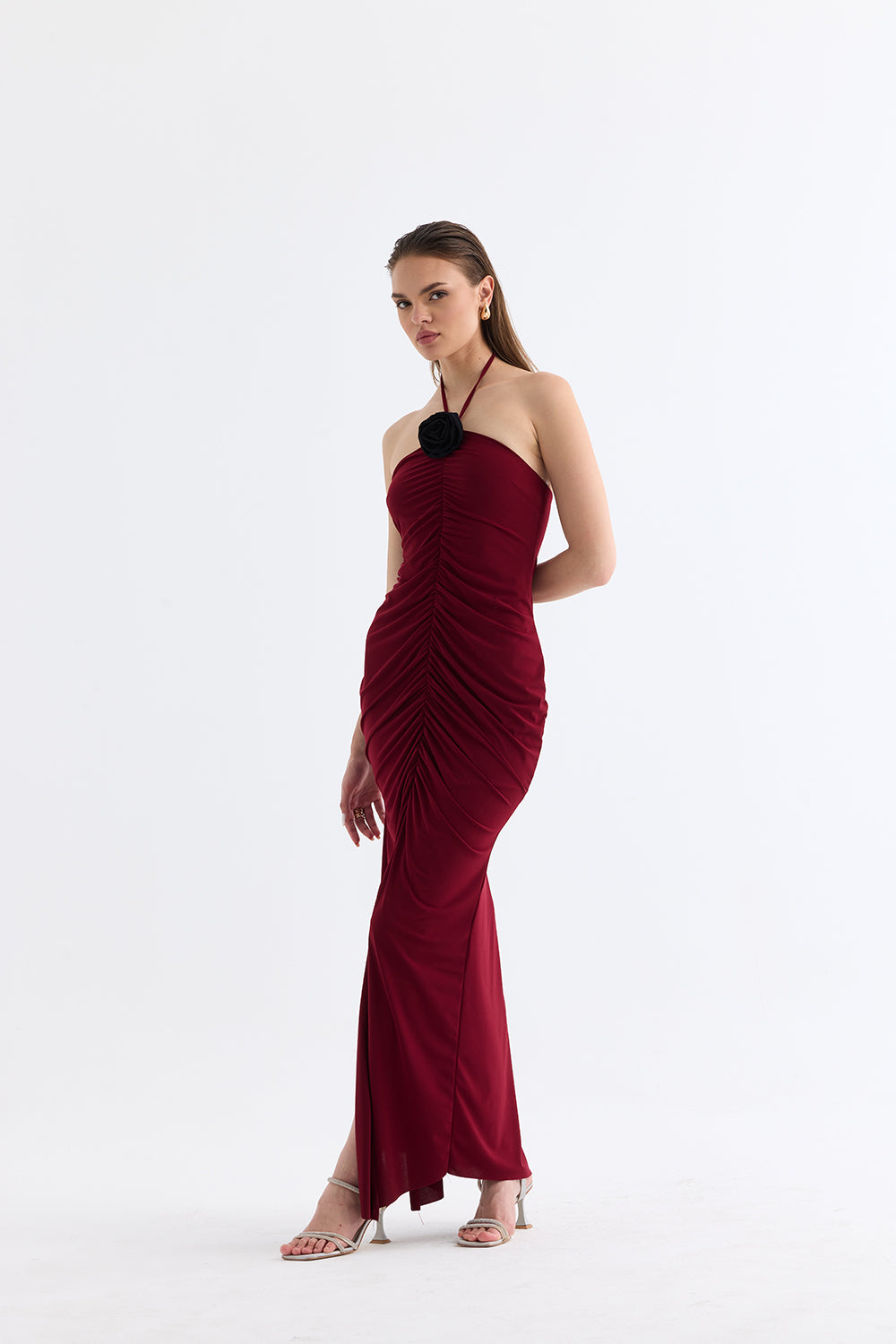 Boyun askılı tasarımı, omuzları zarifçe açığa çıkarırken, yırtmaçlı etek kısmı