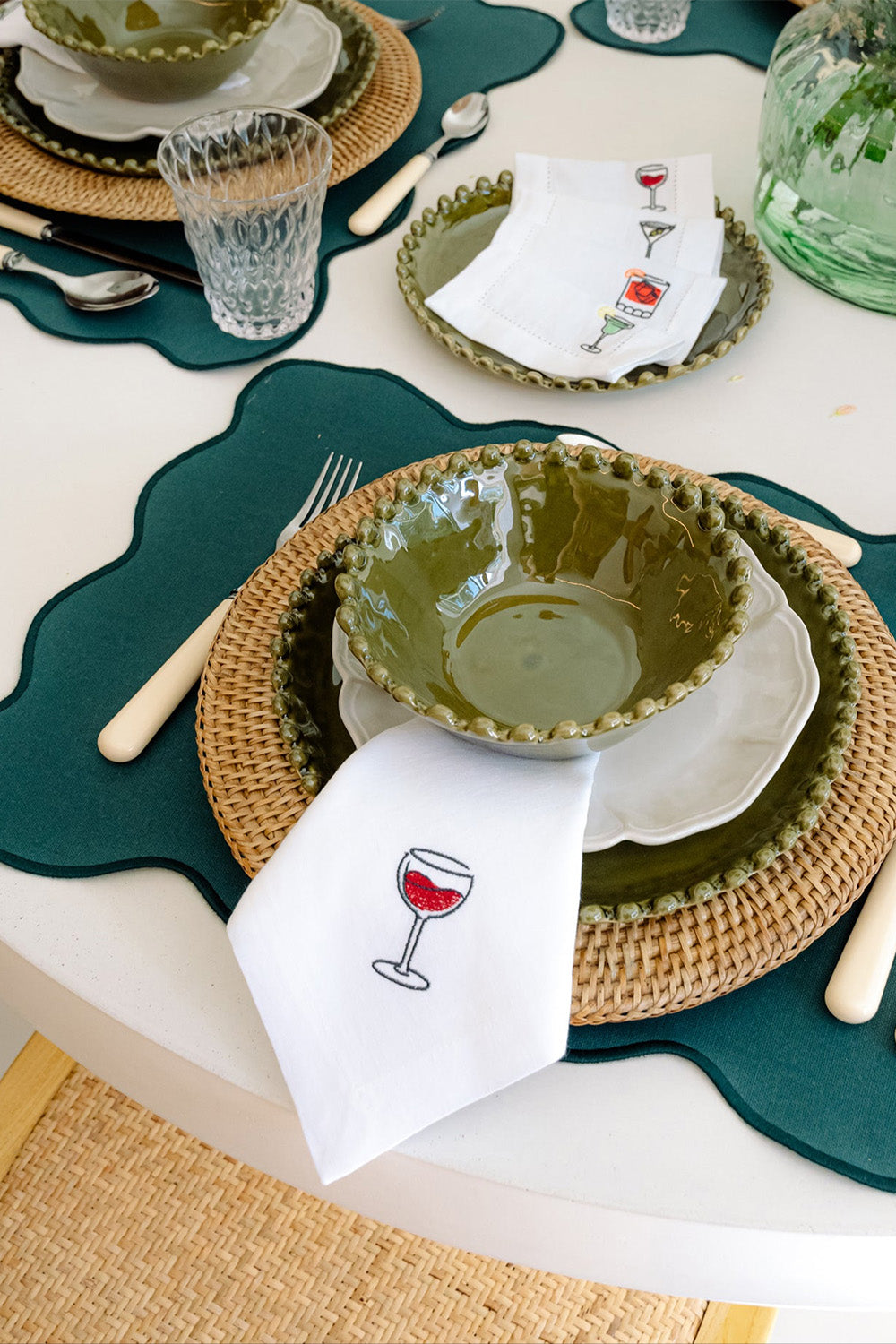 Keten ve pamuk karışımının yumuşak dokusu ile üretilen Wine Peçete, şarap kadehi nakışıyla sofranıza zarafet ve keyif katar. Şık detayları sayesinde romantik akşam yemeklerinden arkadaş davetlerine kadar her ortamda sıcak ve davetkâr bir atmosfer yaratır. Özel günlerde, kutlamalarda ve şarap eşliğinde geçen keyifli sofralarda kusursuz bir tamamlayıcıdır.