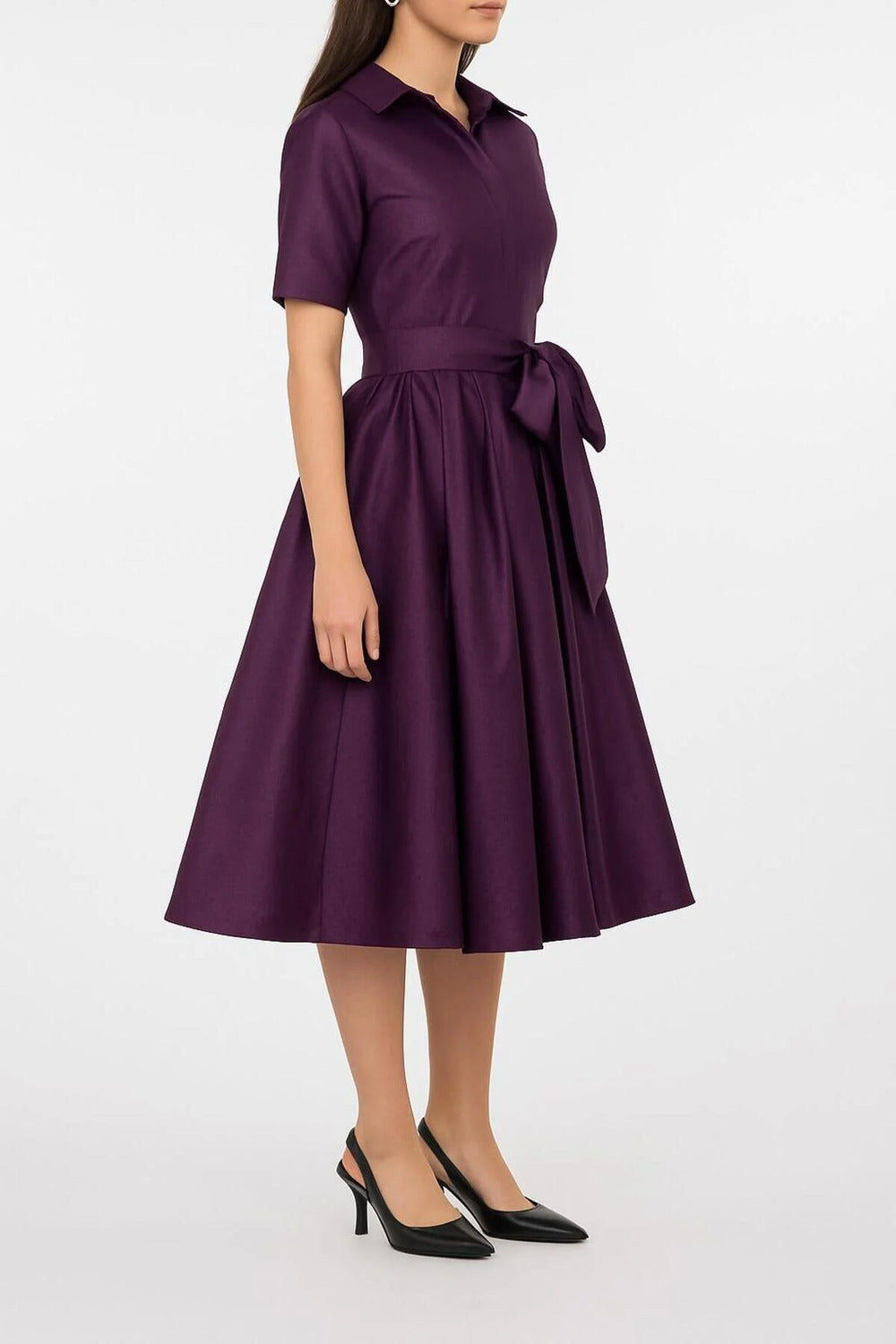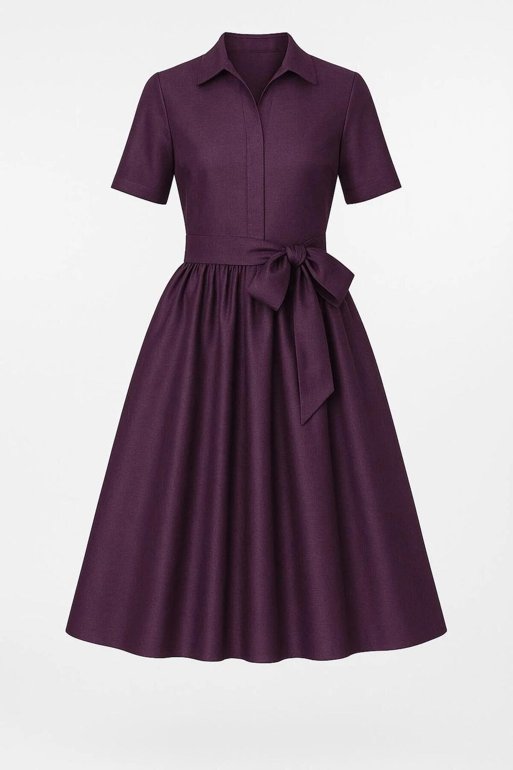 Kuşaklı & Kısa Kollu Midi Boy Tafta Gömlek Elbise
