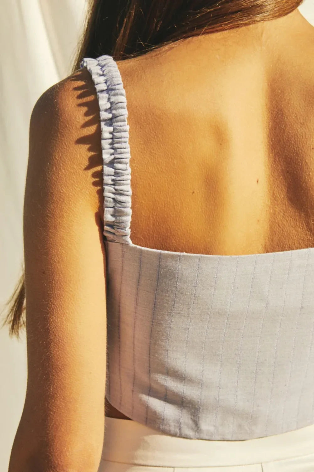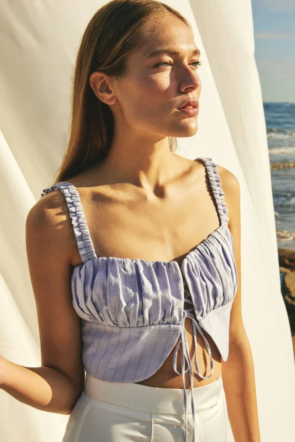 Keten-pamuk karışımı kumaştan üretilen bu üst, kare yakalı ve ortadan ayarlanabilir iplere sahiptir. Romantik havayı yakalamak için kot pantolon ve sandalet ekleyin ya da uyumlu Anville pantolon veya Louis yüksek belli şort ile giyin!