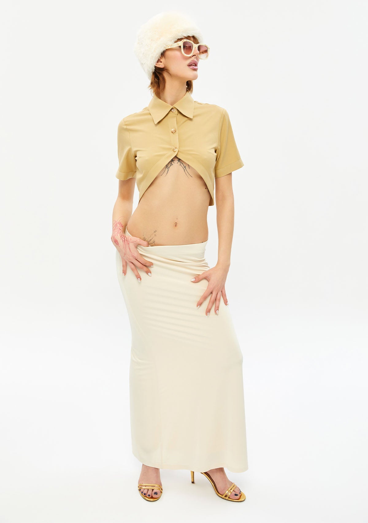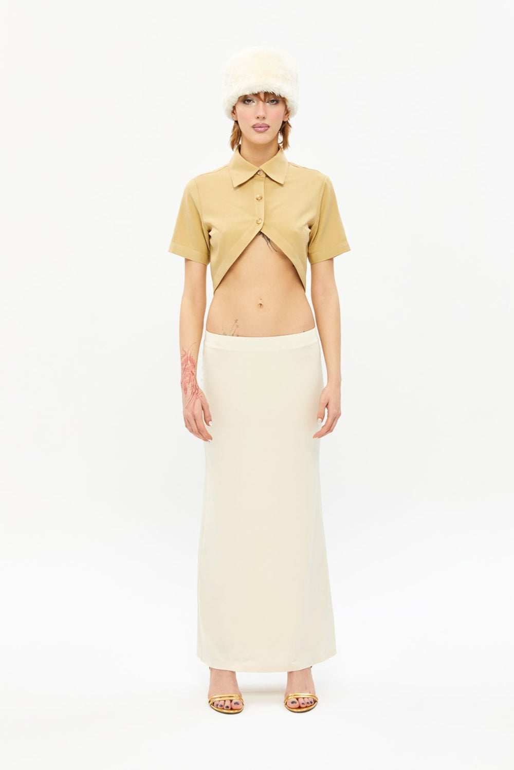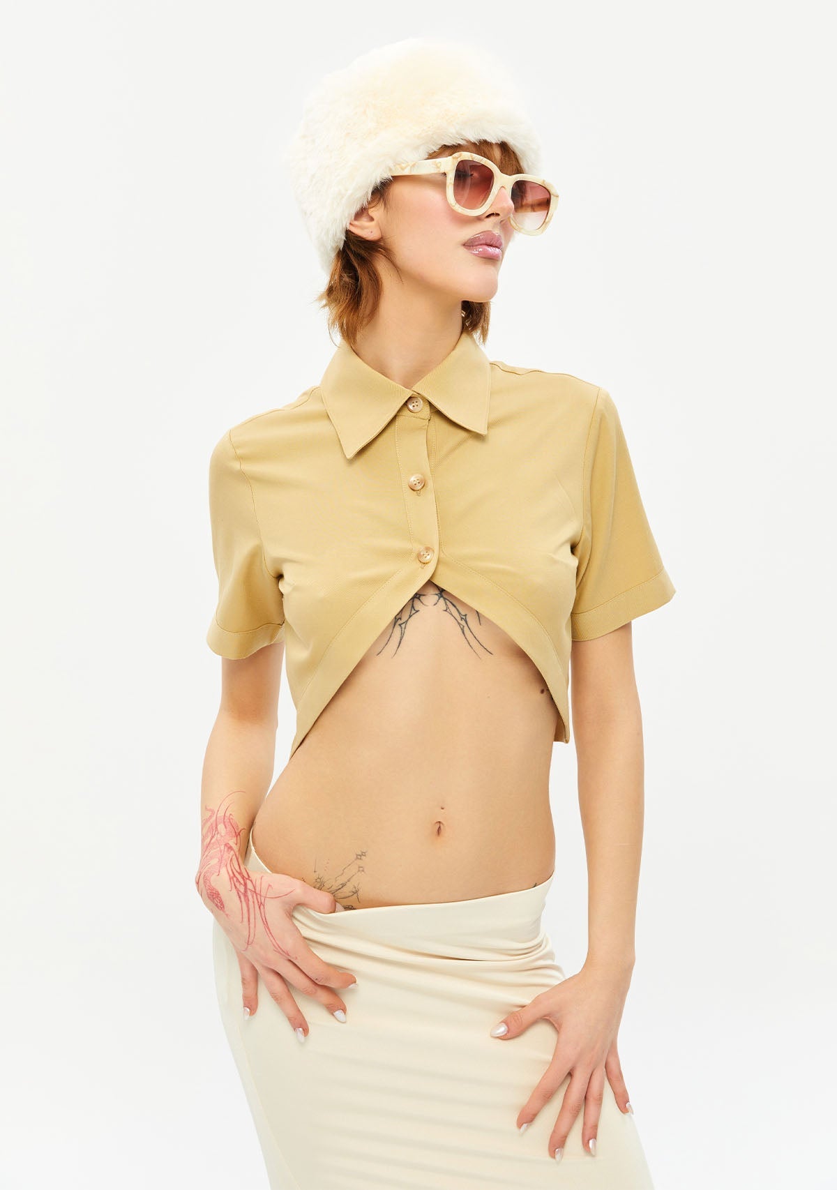 Göbeği Açık Dik Yaka Kısa Bej Gömlek