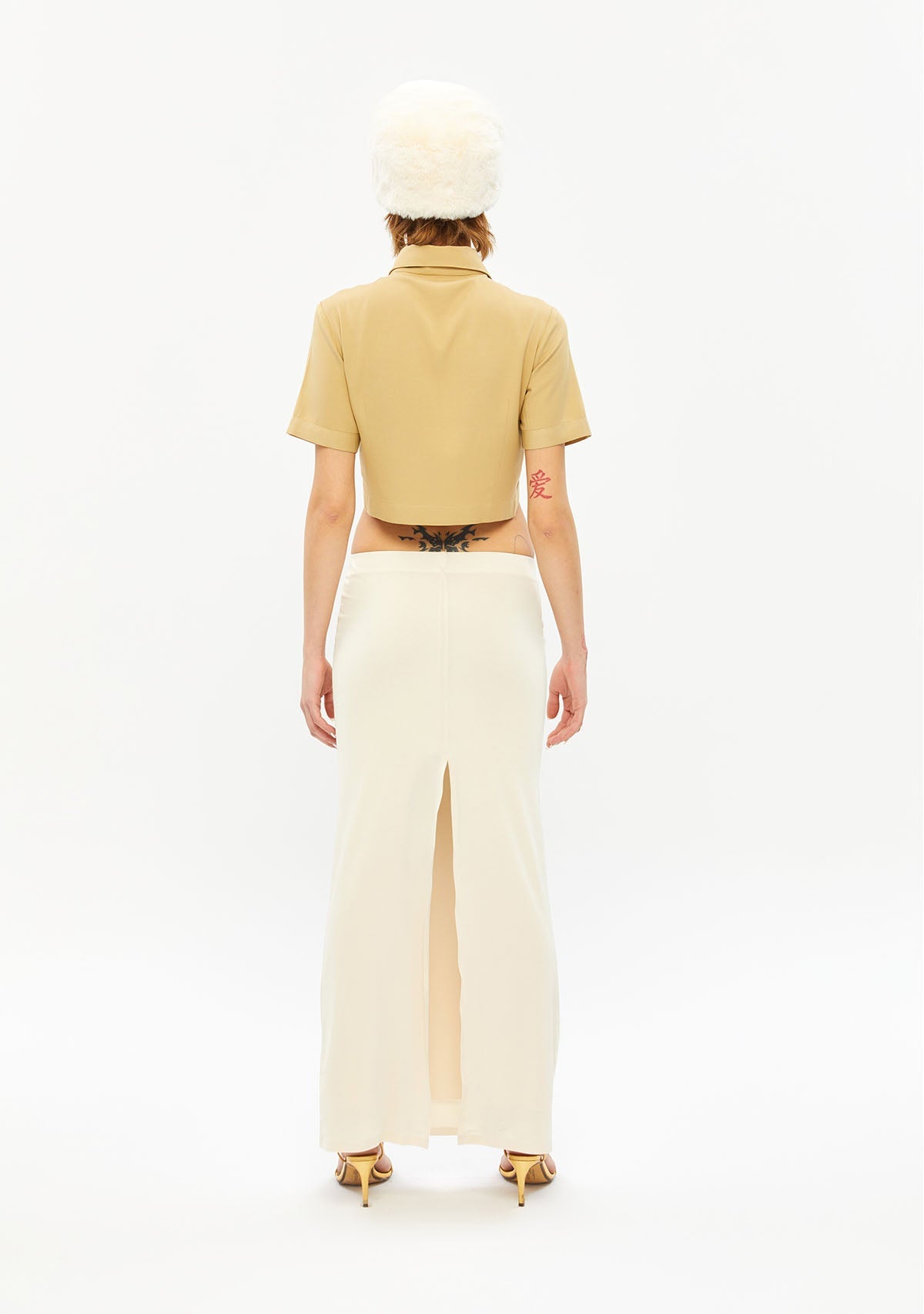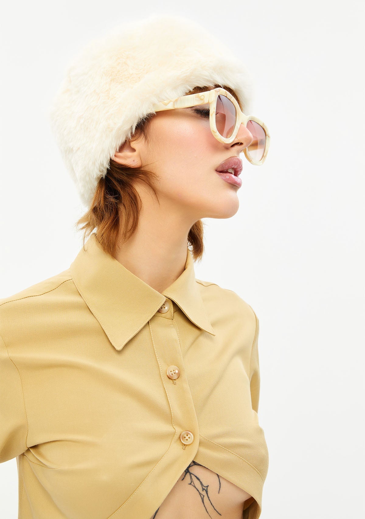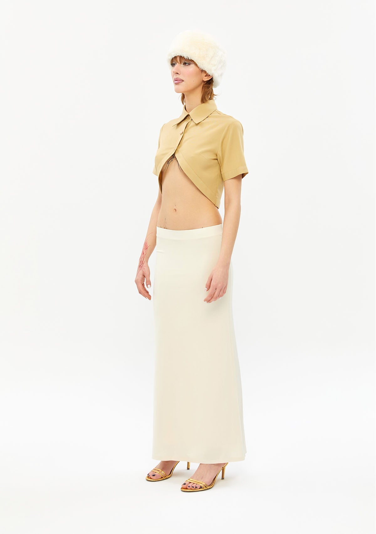 Göbeği Açık Dik Yaka Kısa Bej Gömlek