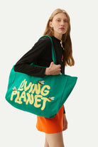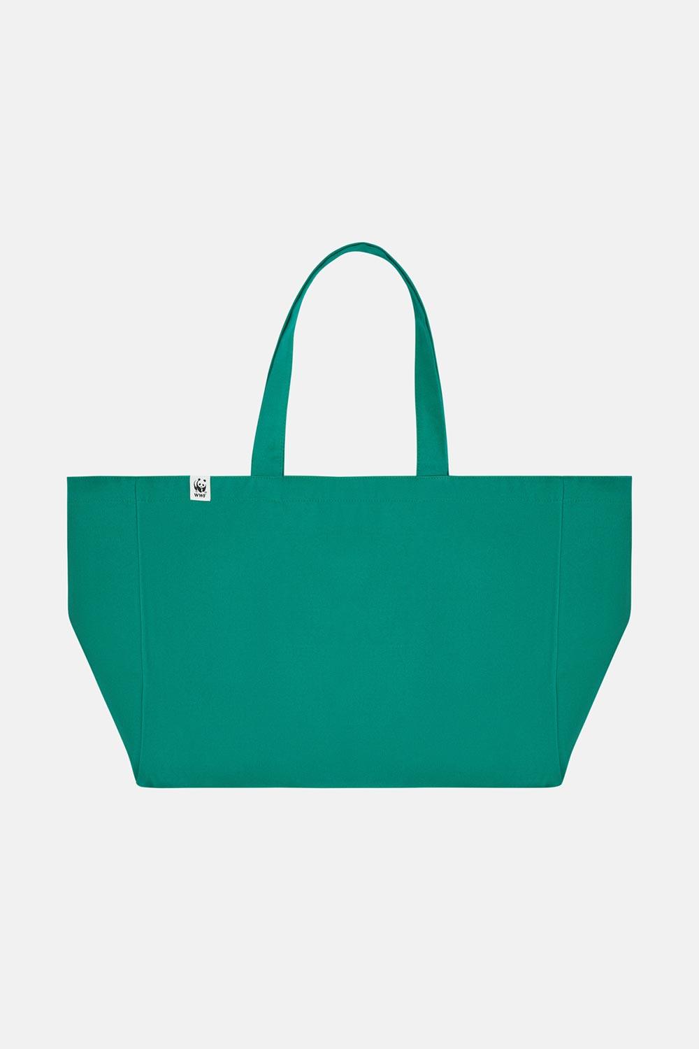 Baskılı, iç-cepli, körüklü, gabardin büyük boy çanta.
